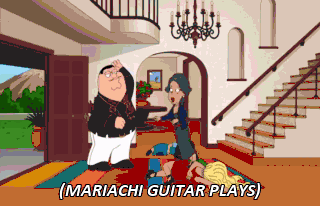 (MARIACHI GUITAR PLAYS) Bueno. (MARIACHI MUSIC PLAYS) Ugh. Peter, can we just get out of here? I want to get this over with.