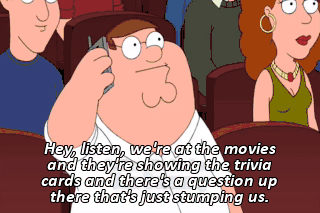 Hey, listen, we're at the movies and they're showing the trivia cards and there's a question up there that's just stumping us.