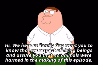 Hi. We here at Family Guy want you to know that we respect all living beings and assure you that no animals were harmed in the making of this episode.