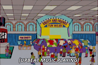 (UPBEAT MUSIC PLAYING) Hey! Hey, hey! Krusty Show T-shirts are made for kids by kids! And we pass the "slavings" on to you! (CHUCKLING) We've got all your favorite characters,