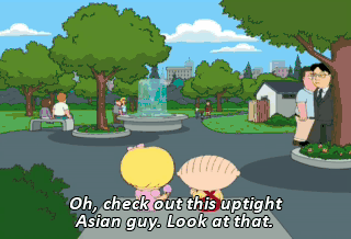 Oh, check out this uptight Asian guy. Look at that. (SINGSONGING TO ASIAN MELODY) "I work really hard, 'cause I'm no fun." (IMITATES GONG)