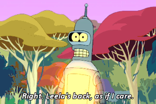 Right. Leela's back, as if I care. (SARCASTICALLY) Whoo!