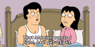 That Martian wants a fight, he'll get a fight. You can't win, Rock! You're 60 years old! Hey, look what Rocky bought me with his money.