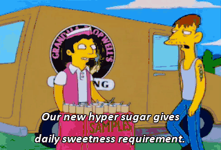 Our new hyper sugar gives you 300% of your minimum daily sweetness requirement. Hmm. Do you suffer from diabetes? No. Well, you do now.