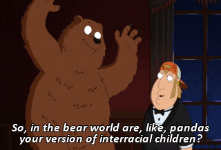 So, in the bear world are, like, pandas your version of interracial children? Yeah. Pandas aren't something I agree with. They're cute, though, right? Just when they're babies.