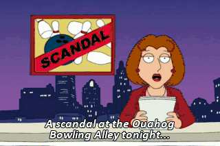 A scandal at the Ouahog Bowling Alley tonight... where a local man, Glenn Quagmire... was charged with peeping in the ladies I room. Coming up, Diane's weight. He's all yours, Joe.