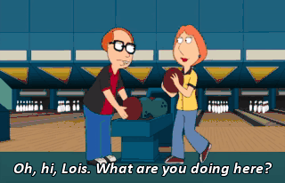 Oh, hi, Lois. What are you doing here? I'm filling in for Peter. He's sick. All right, finally a little harpoon in the bowling alley. All right, what do you say we get this thing started, huh?