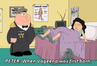 PETER: When Vageena was first born, I had a small heart and a lot to learn. Push, honey! Hurry up and give me my baby boy! (WET SQUELCHING) Cleveland, more SpaghettiOs.