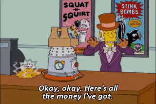 Okay, okay. Here's all the money I've got. Not so fast. I also want some dribble glasses, fake boobs, two of Bart's T-shirts and that rapping toilet seat.