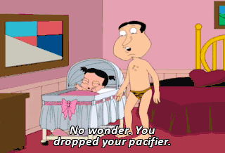 No wonder. You dropped your pacifier. You have a baby? Yeah, it's a long story. Damn kid's kept me up every night for two weeks. Now, where were we? Giggity Giggity... (SNORING)