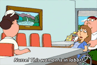 Nurse! This woman is in labor! Excuse me. I was here first.