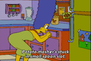 Potato masher's stuck in small spoon slot. What kinda madman would do that? (GRUNTING) (GRUNTS) (GASPS) Ooh. Bart! Honey, I'm so sorry! No problem. Huh. No harm done.