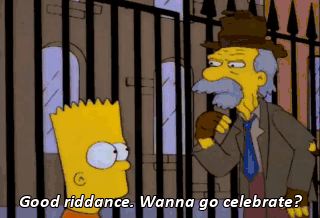 Good riddance. Wanna go celebrate? I feel like liver and onions.