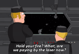 Hold your fire? What, are we paying by the laser now? You don't do the budget, Terry. I do.