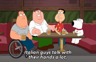 Italian guys talk with their hands a lot, Irish guys drink a lot, black guys change their shirts while they tell you a story.