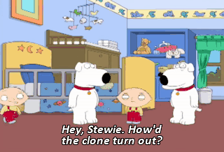 Hey, Stewie. How'd the clone turn out? Brian, I can't go to the bathroom by myself. Will you please help me? But I'm good at other stuff.