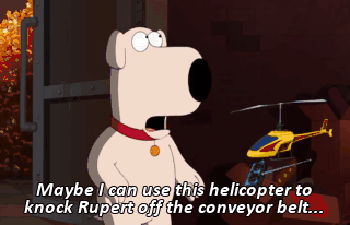 Maybe I can use this helicopter to knock Rupert off the conveyor belt... Ahh! Son of a bitch!