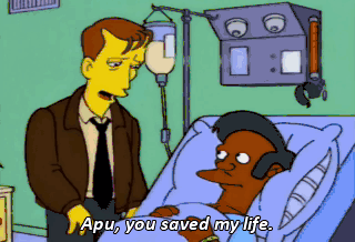 Apu, you saved my life. And as a small token of my appreciation, I got you your job back at the Kwik-E-Mart. Oh! Oh, Mr. Woods, you're-- But as for me, I'm off to battle aliens on a faraway planet.