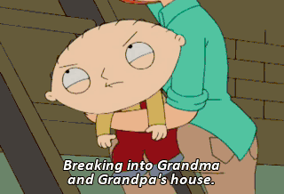 Breaking into Grandma and Grandpa's house. This is more exciting than that time I saw Bobby McFerrin fall down all those stairs. (SCATTING) Cool! Wait. What are you doing? They're sleeping in here.