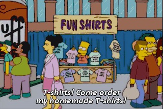 T-shirts! Come order my homemade T-shirts! My mom thinks they're good! Y'all ready for this? (UPBEAT MUSIC PLAYING)