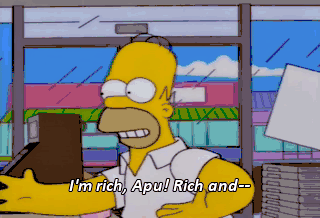 I'm rich, Apu! Rich and-- Money in the bank. Okay, this bacon's done. And now for the profit-taking.