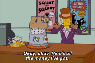 Okay, okay. Here's all the money I've got. Not so fast. I also want some dribble glasses, fake boobs, two of Bart's T-shirts and that rapping toilet seat. Yo, yo, yo Keep it on the low flow