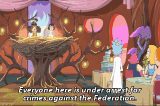 Everyone here is under arrest for crimes against the Federation. L 'chaim! Tammy, what are you doing? Sit your Bird ass down. Tammy? Birdperson!! No!!