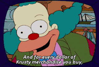 And for every dollar of Krusty merchandise you buy, I will be nice to a sick kid. For legal purposes, sick kids may include hookers with a cold. (LAUGHS)