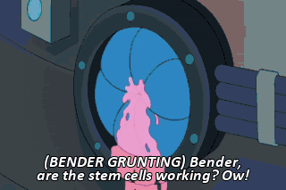(BENDER GRUNTING) Bender, are the stem cells working? Ow! I'm dying. (COUGHS) I need mouth-to-ass resuscitation. I'm on it! (INHALES) (BLOWING) (MUFFLED) It's not working!