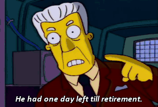 He had one day left till retirement. La la la la la Well, time to replenish the hot-dog roller.