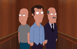(ELEVATOR BELL DINGS) I thought he'd never leave. Me neither. (BOTH SIGHING) Yeah. (ELEVATOR BELL DINGS) Aw, did you guys just do the thing?