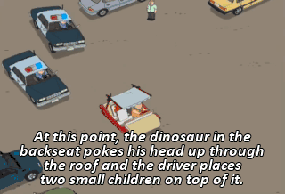 At this point, the dinosaur in the backseat pokes his head up through the roof and the driver places two small children on top of it.