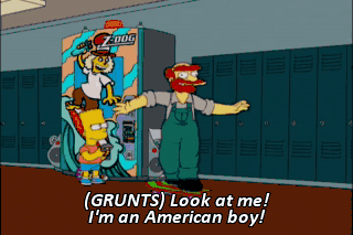 (GRUNTS) Look at me! I'm an American boy!