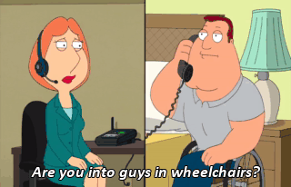 - Are you into guys in wheelchairs? - Not really. Oh, that's too bad, 'cause my son's in a wheelchair.
