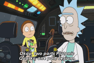 Okay, two parts Plutonic Quarks, one part Cesium. Okay. Uh-huh. All right. Now empty the water bottle into the bucket and pour it all into the fuel tank so we can get the hell out of here!
