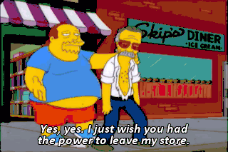 Yes, yes. I just wish you had the power to leave my store. Mmm, mmm, mmm. You almost had it there. Bart, your prank cost $10 million in damages. I know. I'm sorry. Sorry for what?
