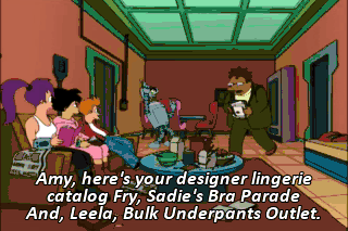 Amy, here's your designer lingerie catalog Fry, Sadie's Bra Parade And, Leela, Bulk Underpants Outlet.
