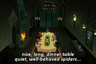 nice, long, dinner table quiet, well-behaved spiders... graveyard adjacent. Yep, it's going to be... What is it? That painting. The eyes are watching me. Hmm. It has motor eye sensors attached to motion detectors.