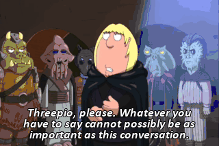Threepio, please. Whatever you have to say cannot possibly be as important as this conversation.
