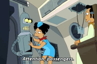 Attention, passengers. Please remain seated until the plane comes to a complete crash. (EVERYONE SCREAMING) Perhaps we should reconsider the girlie calendar. LEELA: Flight attendant's log.