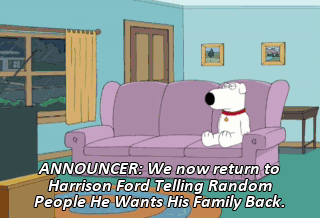 ANNOUNCER: We now return to Harrison Ford Telling Random People He Wants His Family Back. I want my family back. Okay.