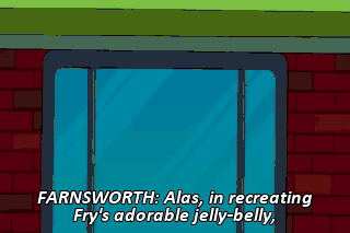 FARNSWORTH: Alas, in recreating Fry's adorable jelly-belly, she had overstuffed him with copper wadding.