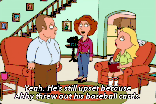 Yeah. He's still upset because Abby threw out his baseball cards. Oh, Maybe I should make him a sandwich. Oh, Dad. That's your solution to everything. Dad! Dad! What? 8 is enough.