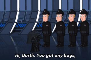 Hi, Darth. You got any bags, or did you leave Mrs. Vader at home? It's you? Are we already out of our own characters? What? How's the construction going? Oh, fantabulously.