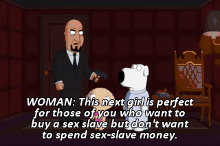 WOMAN: This next girl is perfect for those of you who want to buy a sex slave but don't want to spend sex-slave money. Oh, my God, Meg! Wonder what music they're gonna use for her? (FAIL MUSIC PLAYING)