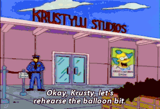 Okay, Krusty, let's rehearse the balloon bit. Look, kids! A horsie! And what are you making, Sideshow Luke Perry? A 19th-century carousel. Upstage me, will ya?