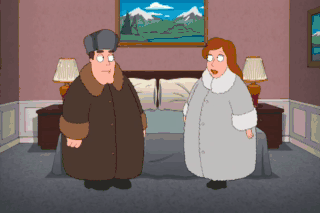 (IN RUSSIAN ACCENT) All right, drop the coats on three. One, two, three! Yeah! Oh...