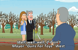 Well, well, well, if it isn't Mayor "Guns For Toys" West. The chair recognizes your face! En garde! Is the park open? Not yet!