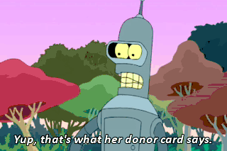 Yup, that's what her donor card says. Goodbye, my love. (SOBBING) (BIRDS CAWING)
