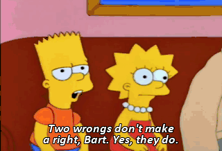 Two wrongs don't make a right, Bart. Yes, they do. - No, they don't. - Yes, they do. No, they don't. Dad! Yes, they do.